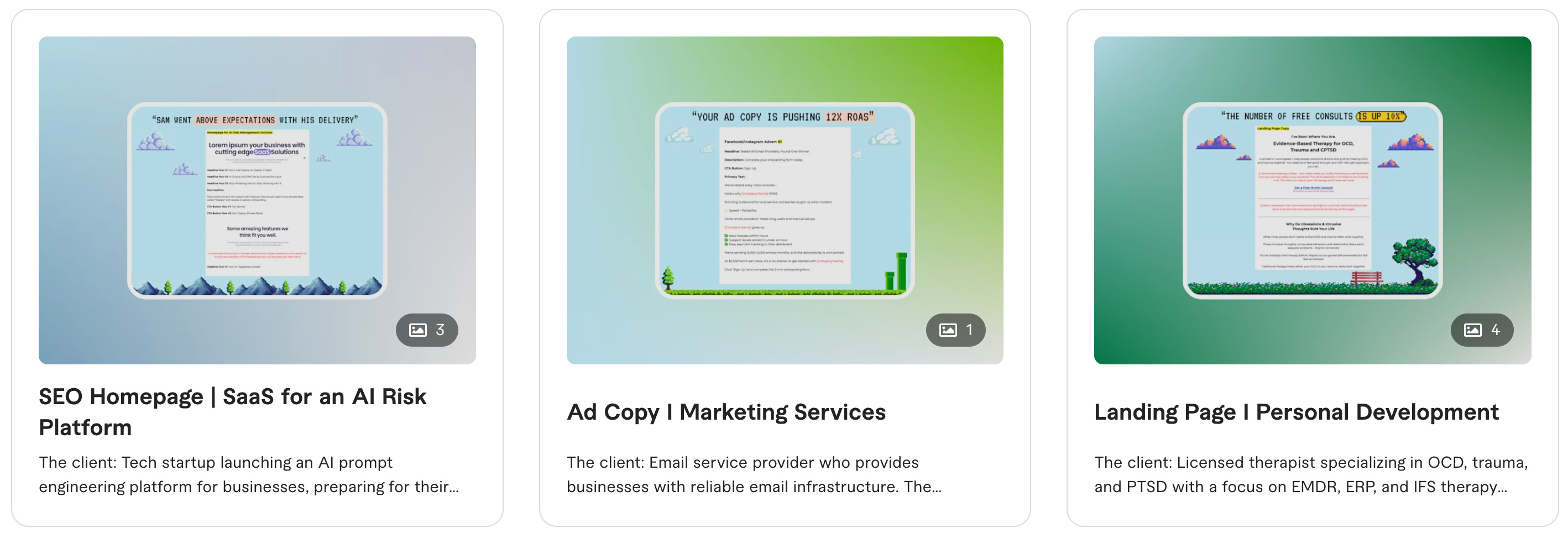 Client testimonials with specific results (āYour ad copy is pushing 12X ROASā)