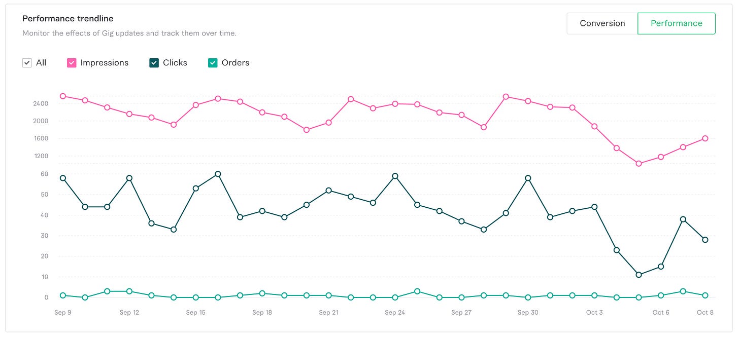 Every week, I dive into Fiverrās Analytics to study whatās actually working - impressions, click-through rate, conversion rate, and the past 30-day trend line.