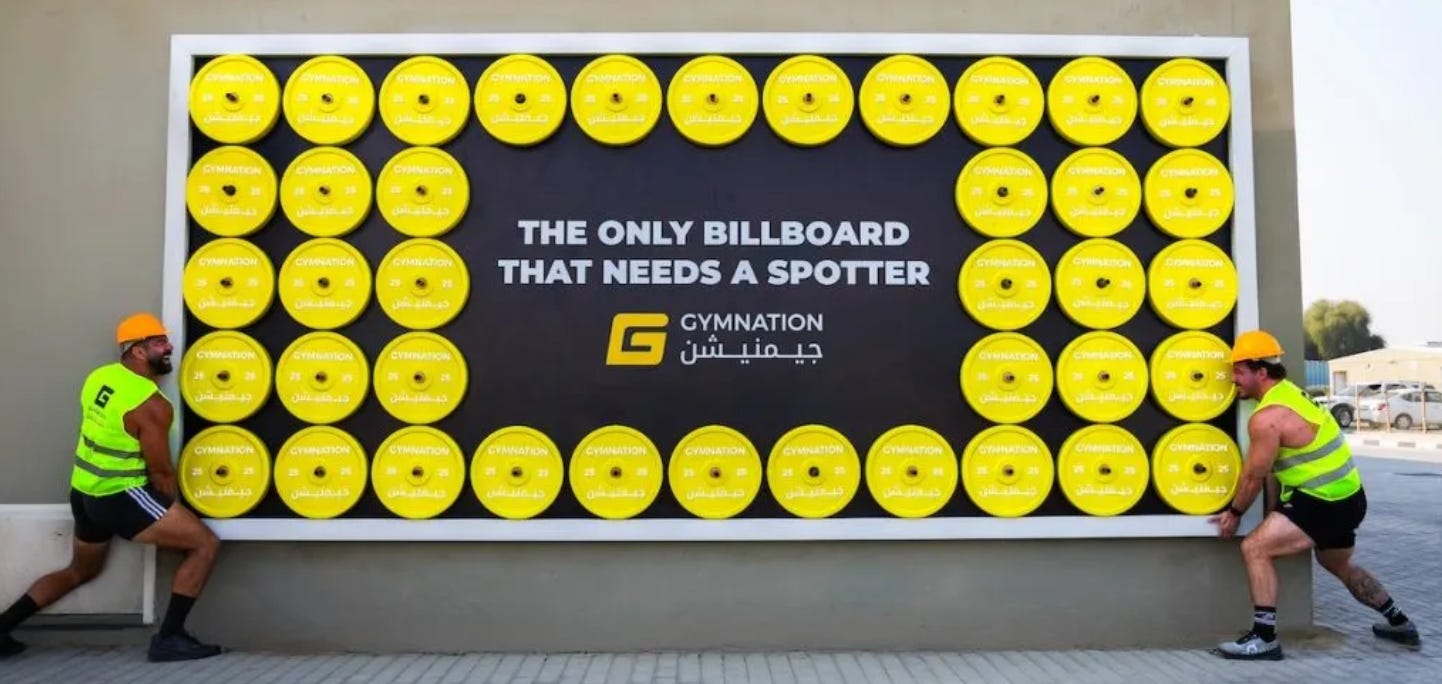 GymNation in Dubai built a 1-ton billboard made of 40 weight plates to promote their Strongman class.